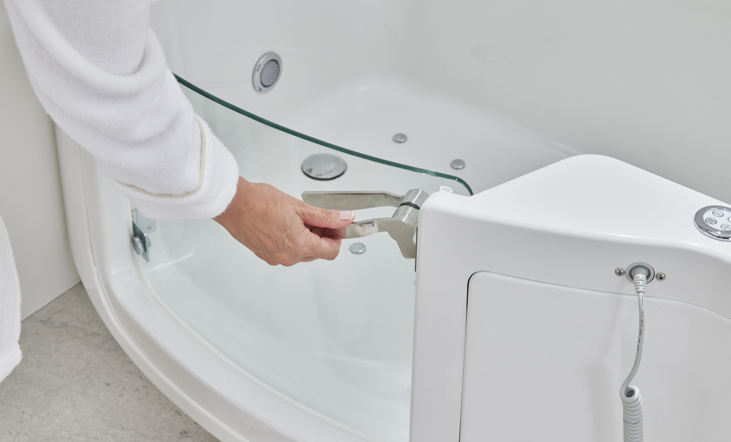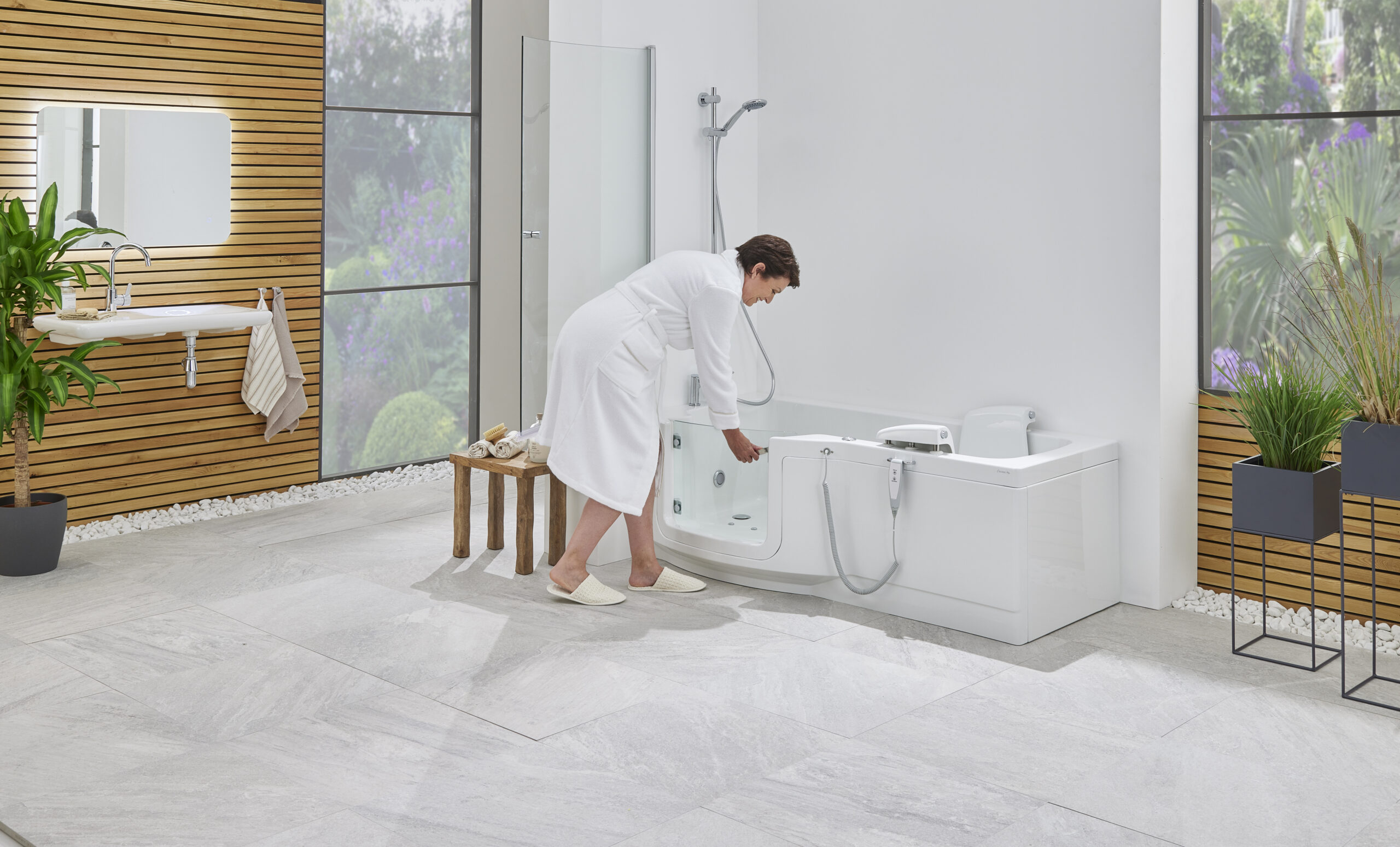 If you are looking for all the benefits of the Louisiana, but bathroom space is more of a challenge, then the slimline Indiana is the solution for you. It still provides the perfect combination of spacious bathing and wider showering area, however its P-shaped footprint is smaller. It encompasses enhanced minimal looks and the very latest assistive features for ultimate relaxation. The Indiana is number one for safety and comfort. It has advanced slip resistant surfaces and a generously wide, low access door. This stylish glass opening has been specifically designed for maximum safety and can be lifted out of position if rapid access is required.